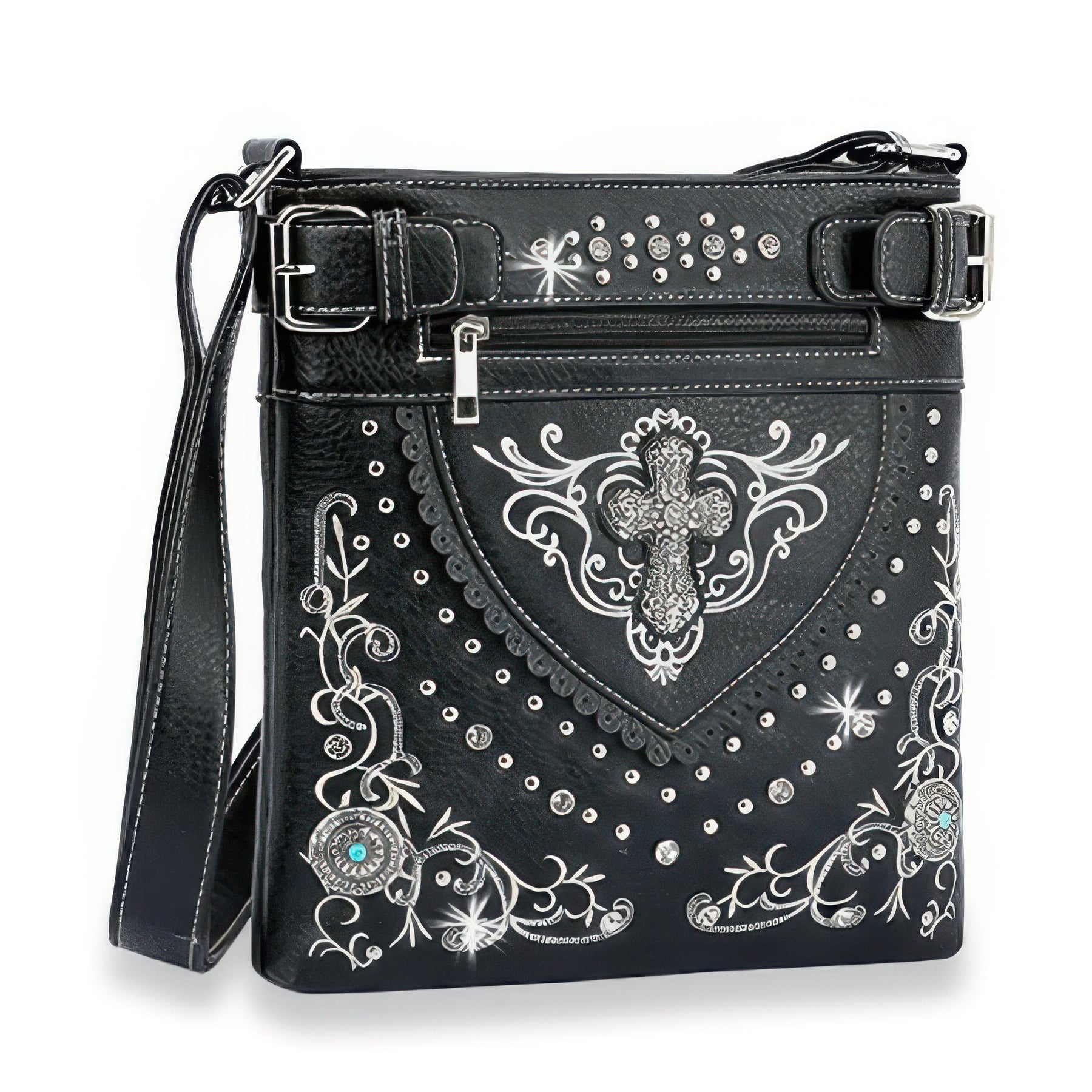 Blend Western flair with practical function in the Western Cross Studded Concealed Carry Bag. This vegan leather bag features rhinestone and embroidery accents surrounding a cross motif, delivering bold, rustic charm. Designed with a concealed carry compartment, it balances security and style for everyday confidence. The adjustable strap ensures versatile wear as a shoulder or crossbody bag. Ideal for rodeos, festivals, or everyday use, it brings a statement finish to your accessories collection.