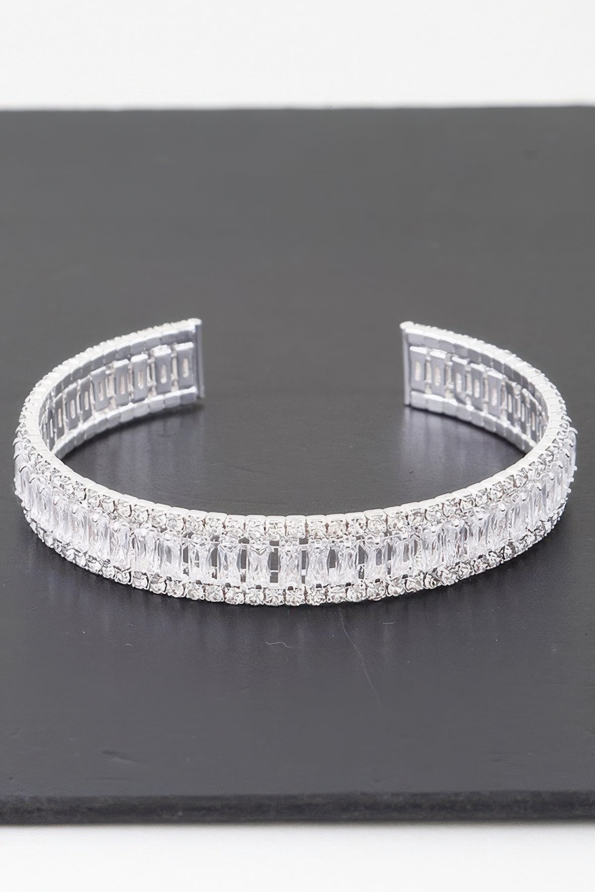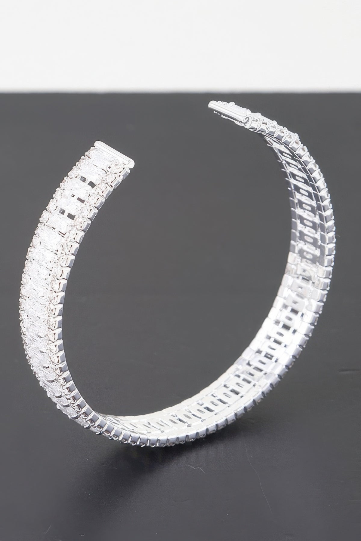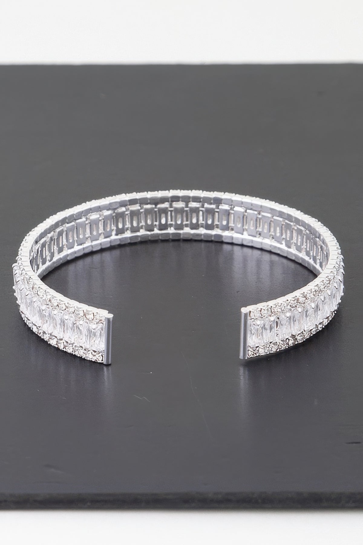 Fabric: The bracelet features a high-quality silver-plated cuff, adorned with multiple clear cubic zirconia stones that create a dazzling effect.