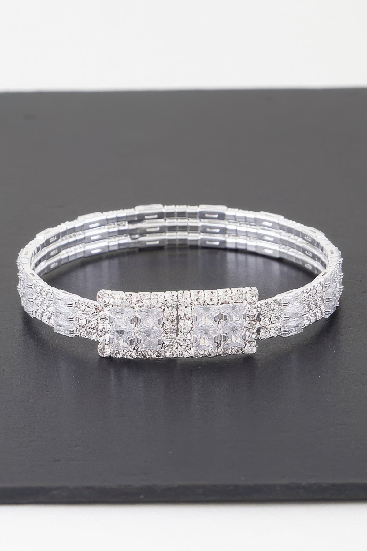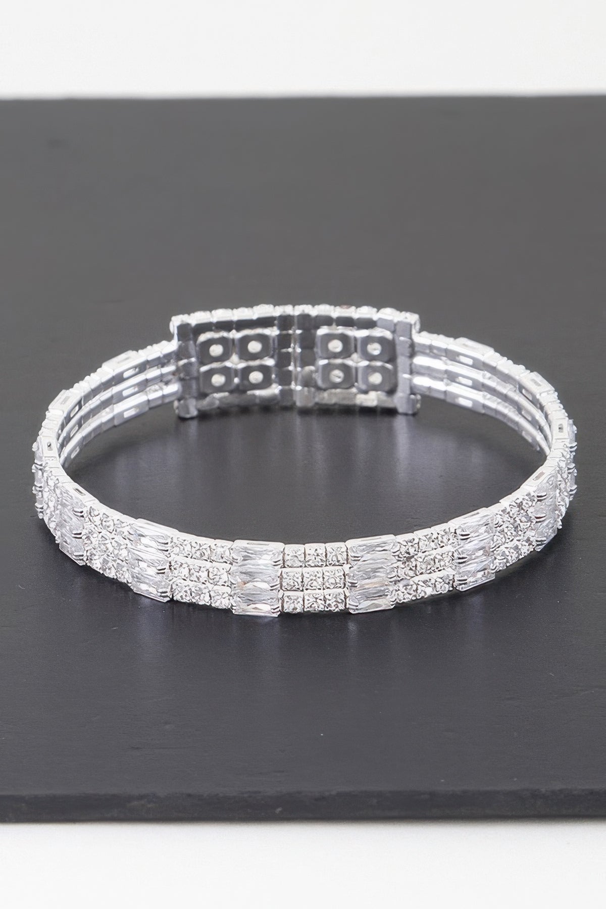 Fabric: The bracelet features a high-quality silver-plated band adorned with multiple clear cubic zirconia stones, adding a sophisticated sparkle to your wrist.