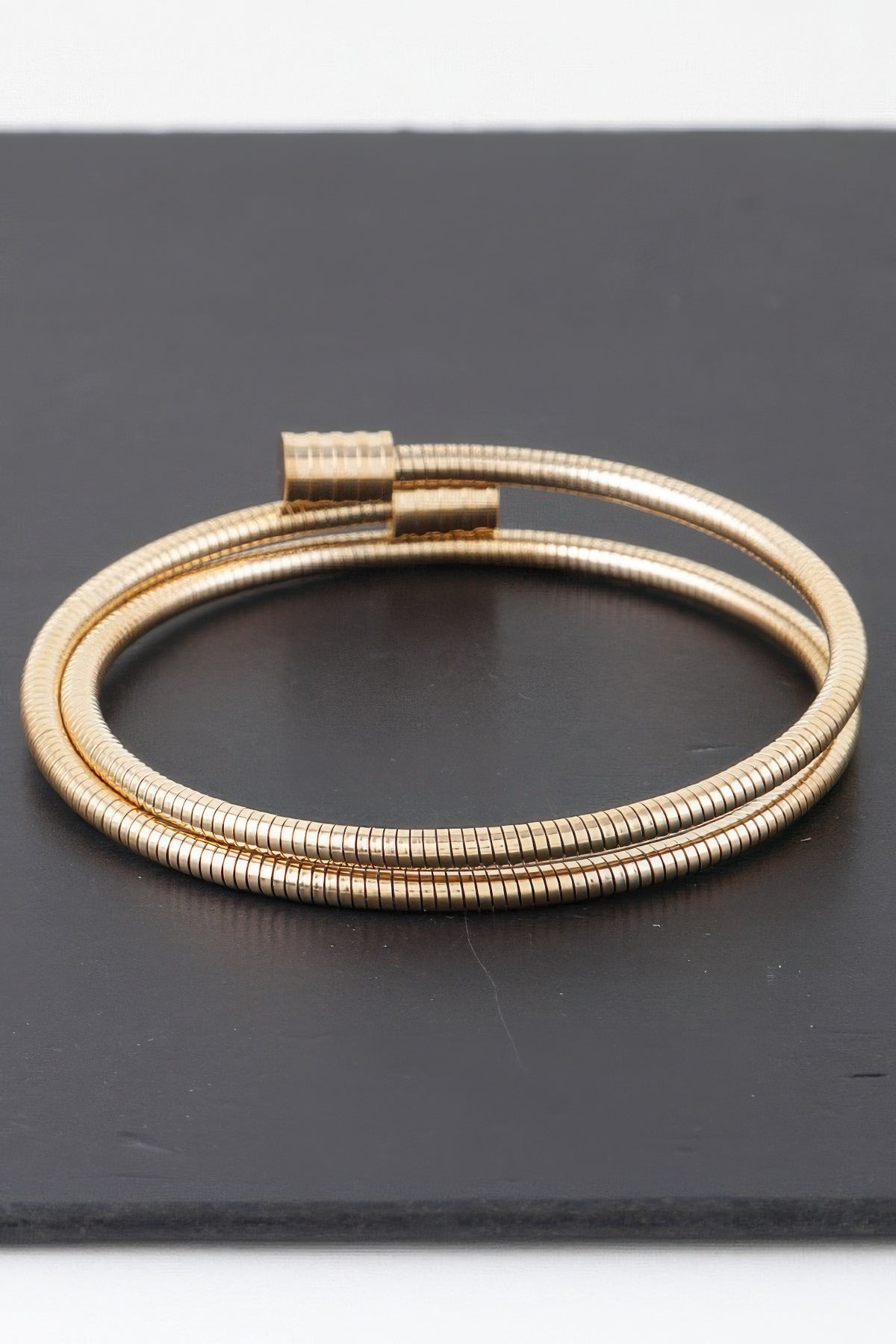 Add the Coil Wrapped Bracelet to your cart today and enjoy a stylish and modern piece that adds a unique touch to any look!