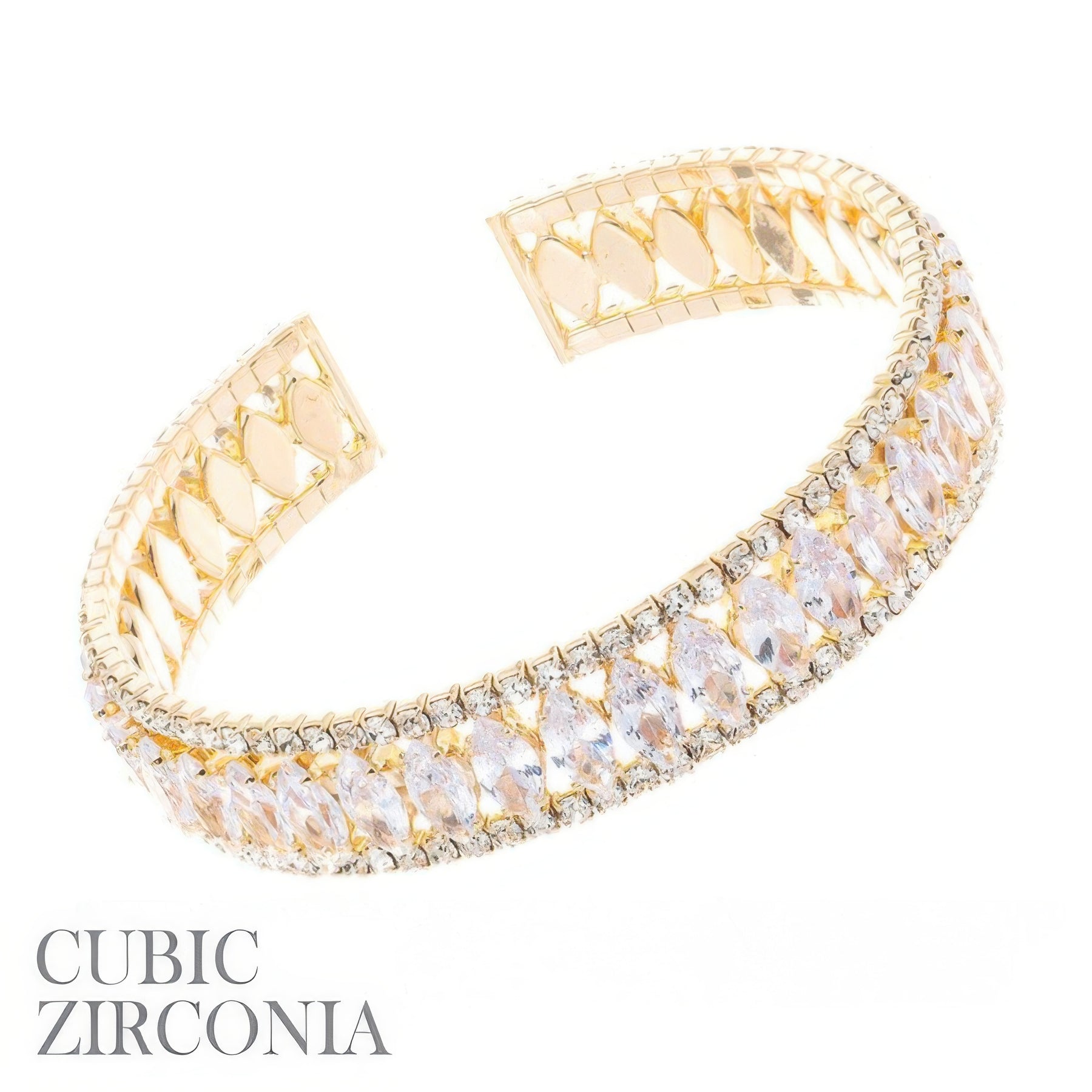 Add timeless sparkle to your wrist with the Marquise Cut Cubic Zirconia Cuff Bracelet. Designed with shimmering marquise-cut stones and finished in a sleek silhouette, this cuff delivers both modern elegance and classic appeal. The adjustable fit ensures comfort, while the slender width makes it easy to layer or wear solo for a refined statement. Perfect for special events or adding polish to your daily wardrobe.