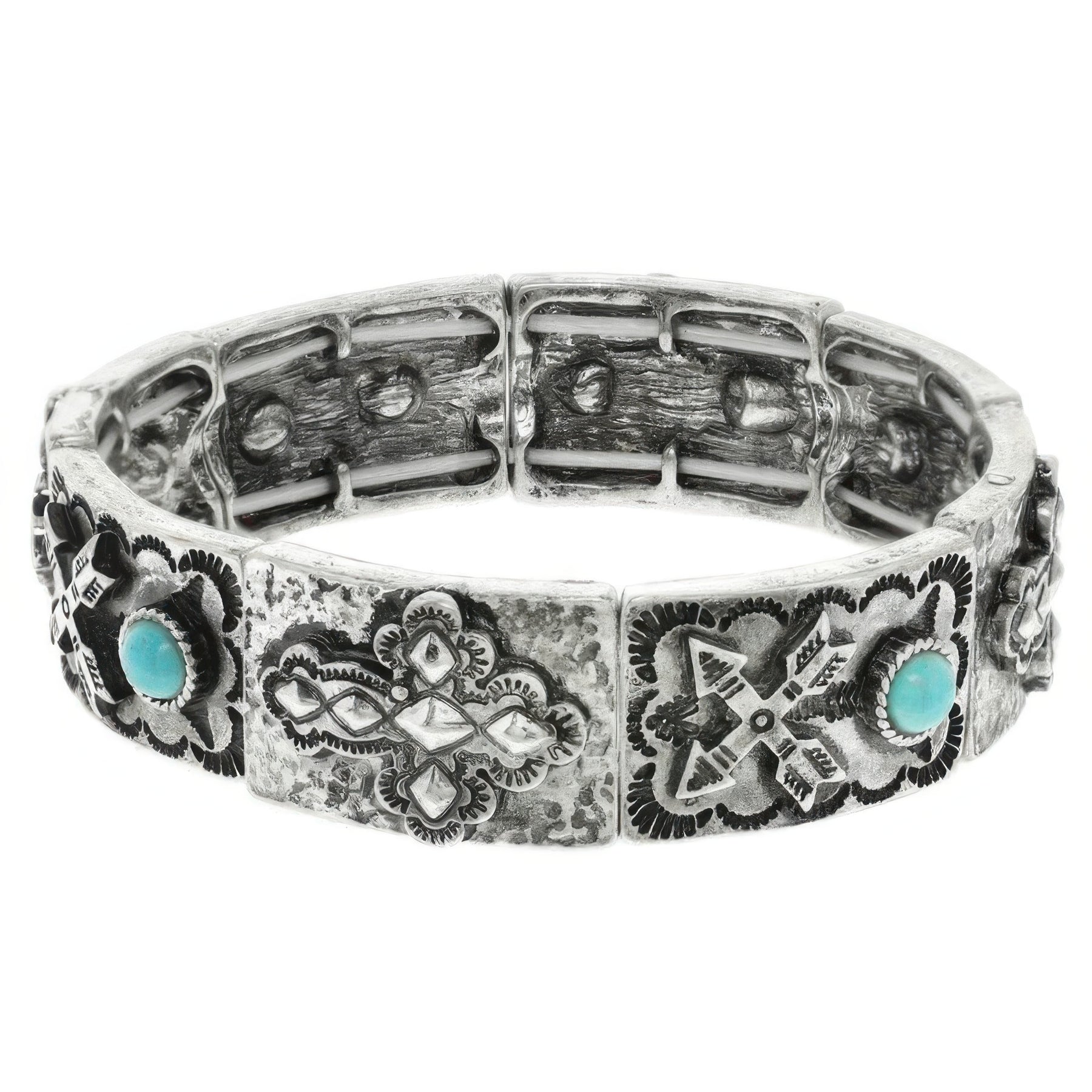 Celebrate your faith and style with this Western Cross Stretch Bracelet. Featuring a series of die-struck cross motifs and turquoise accents, this piece is crafted in mixed bronze and silver-tone metals for a rustic yet refined look. The flexible stretch design ensures a secure, comfortable fit on any wrist. It's a meaningful accessory for church gatherings, country events, or everyday wear. Whether you're gifting or accessorizing, this bracelet blends tradition with timeless charm.