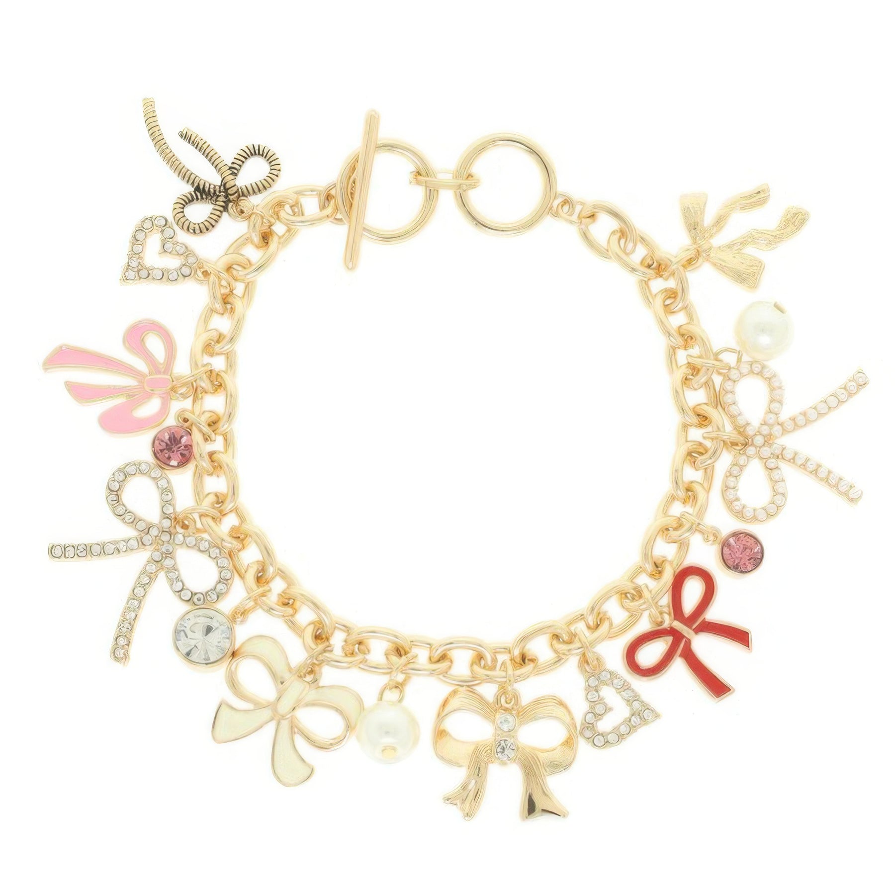 Add a touch of graceful charm to your jewelry collection with this crystal rhinestone and pearl-embellished bow bracelet. Crafted in your choice of gold-tone or silver-tone metal, it features a delicate enamel bow that sparkles with feminine elegance. The toggle closure ensures a secure and comfortable fit, while the shimmering accents bring just the right amount of glamour for both casual and dressy occasions. Lightweight and adjustable, this bracelet makes a thoughtful gift for birthdays, bridal showers, or a stylish treat for yourself. Whether you're heading to brunch, a party, or date night, this versatile piece completes any look with polished charm.