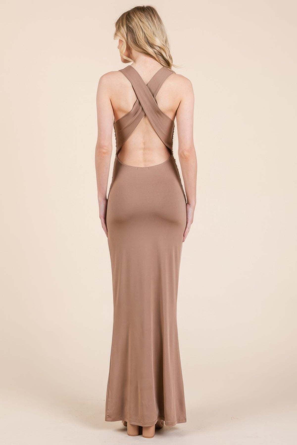 Add the Cowl Neck Cross Back Shirring Maxi Dress in True Taupe to your wardrobe today and enjoy the perfect mix of style, comfort, and sophistication!