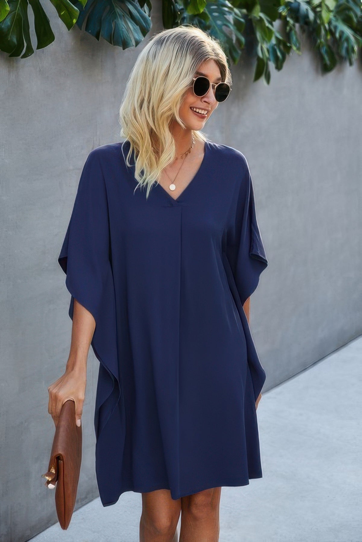 Features: V Neck, Short Sleeve, Solid, Loose Fit, Casual, Short Dress