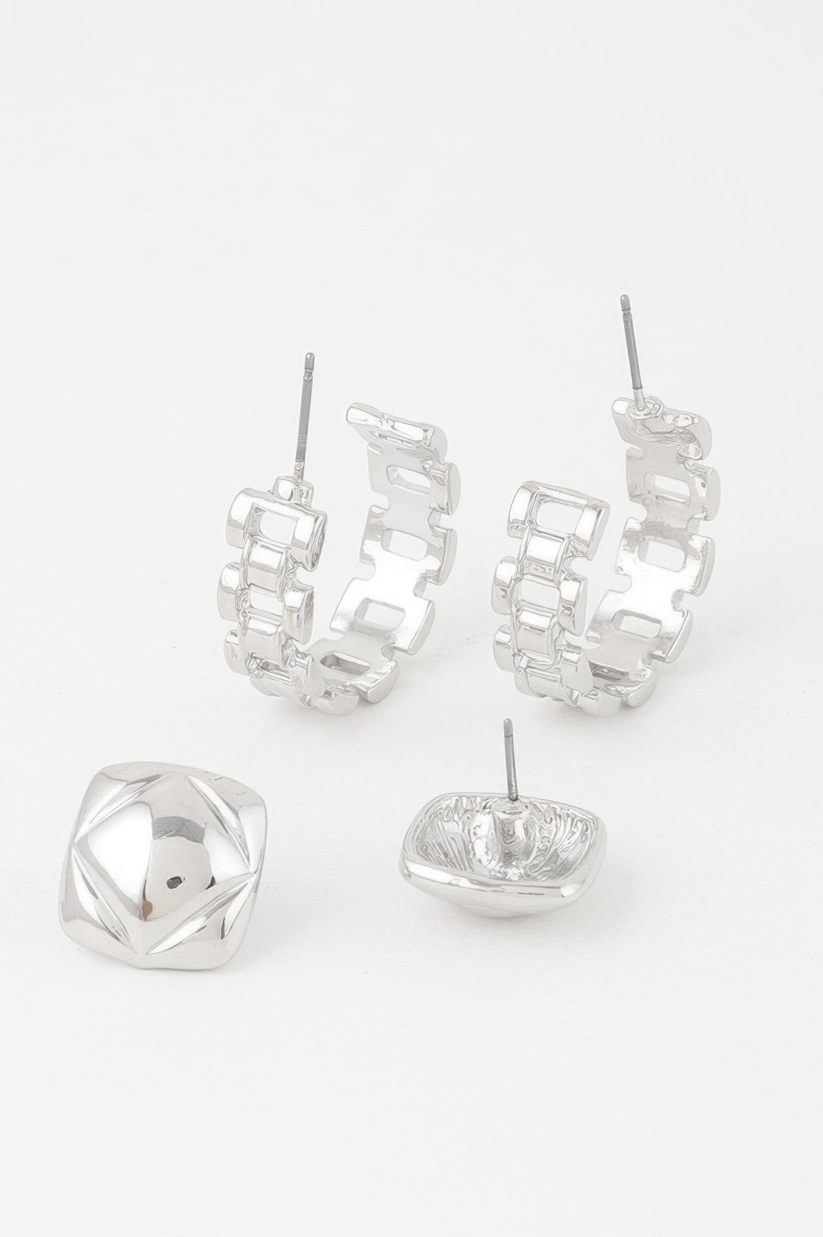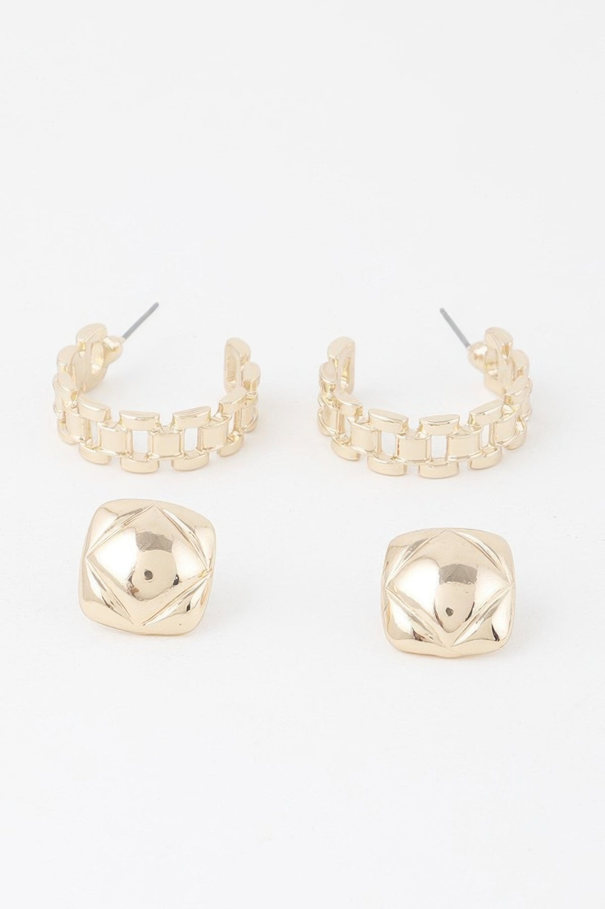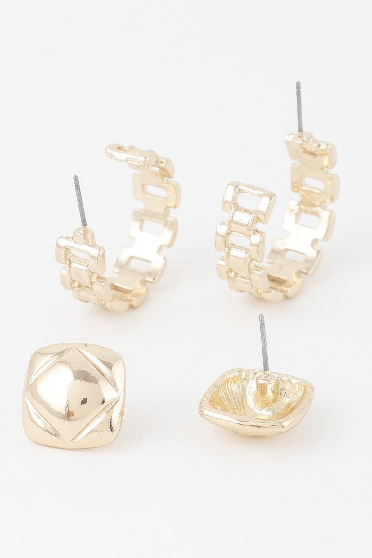 Sculptural and sleek, the Gold Link Cuff Earrings Set adds a bold architectural element to your style. These 1" x 1" earrings mimic the look of mini cuffs with a chunky gold link finish. Their compact size makes them perfect for everyday wear, while their shine adds an elevated edge. Wear them with sharp tailoring or modern basics for a polished, on-trend finish.