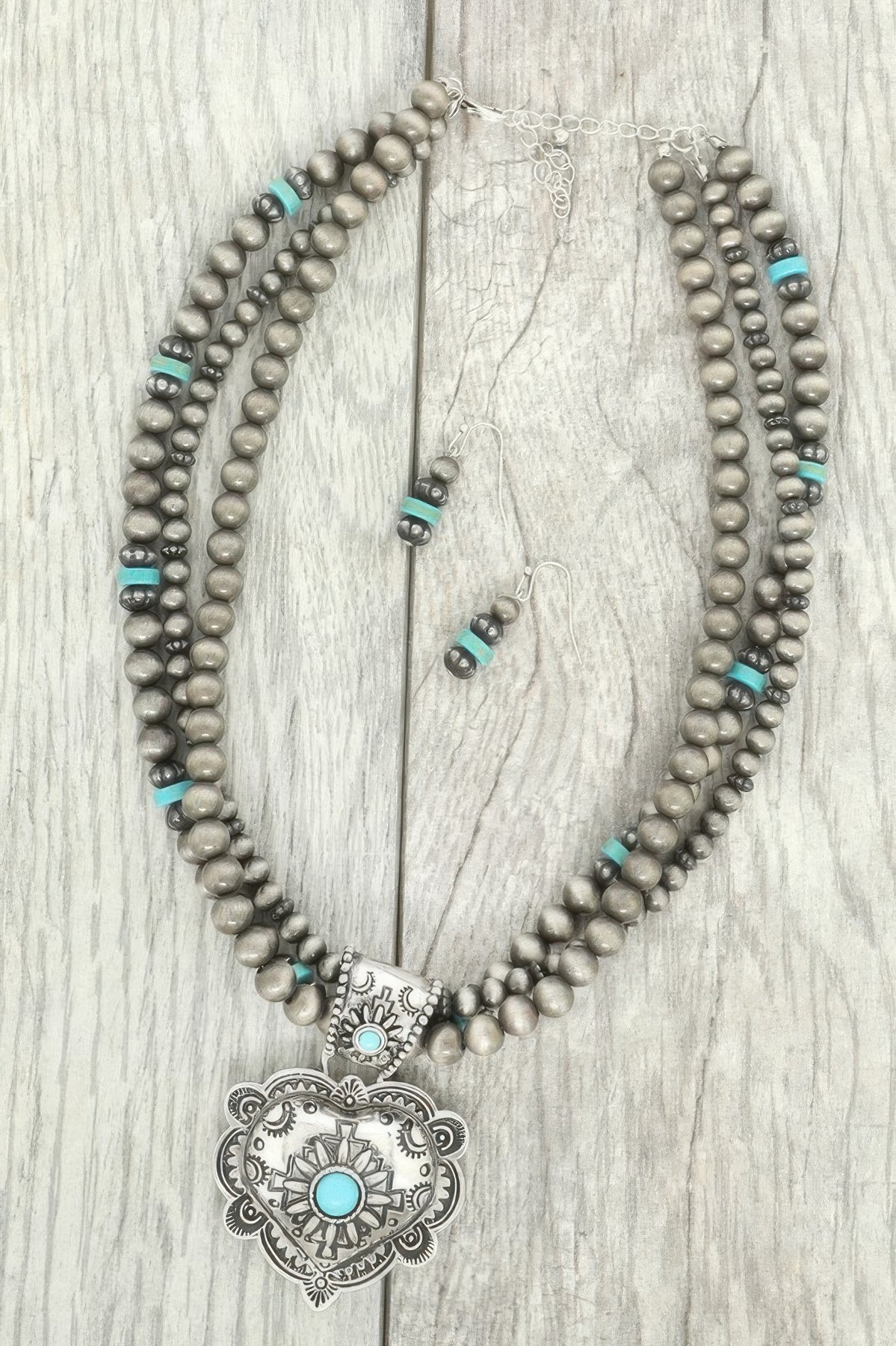 Romantic yet rugged, this multistrand necklace and earring set features a heart-shaped turquoise pendant with Western flair. The beaded strands offer texture and movement, while the oxidized metal adds a vintage finish. Coordinated earrings complete the look for a polished, cohesive style. Perfect for date nights, themed events, or everyday expression, this set brings together sentiment and Southwestern charm. It’s a standout accessory that tells a story.