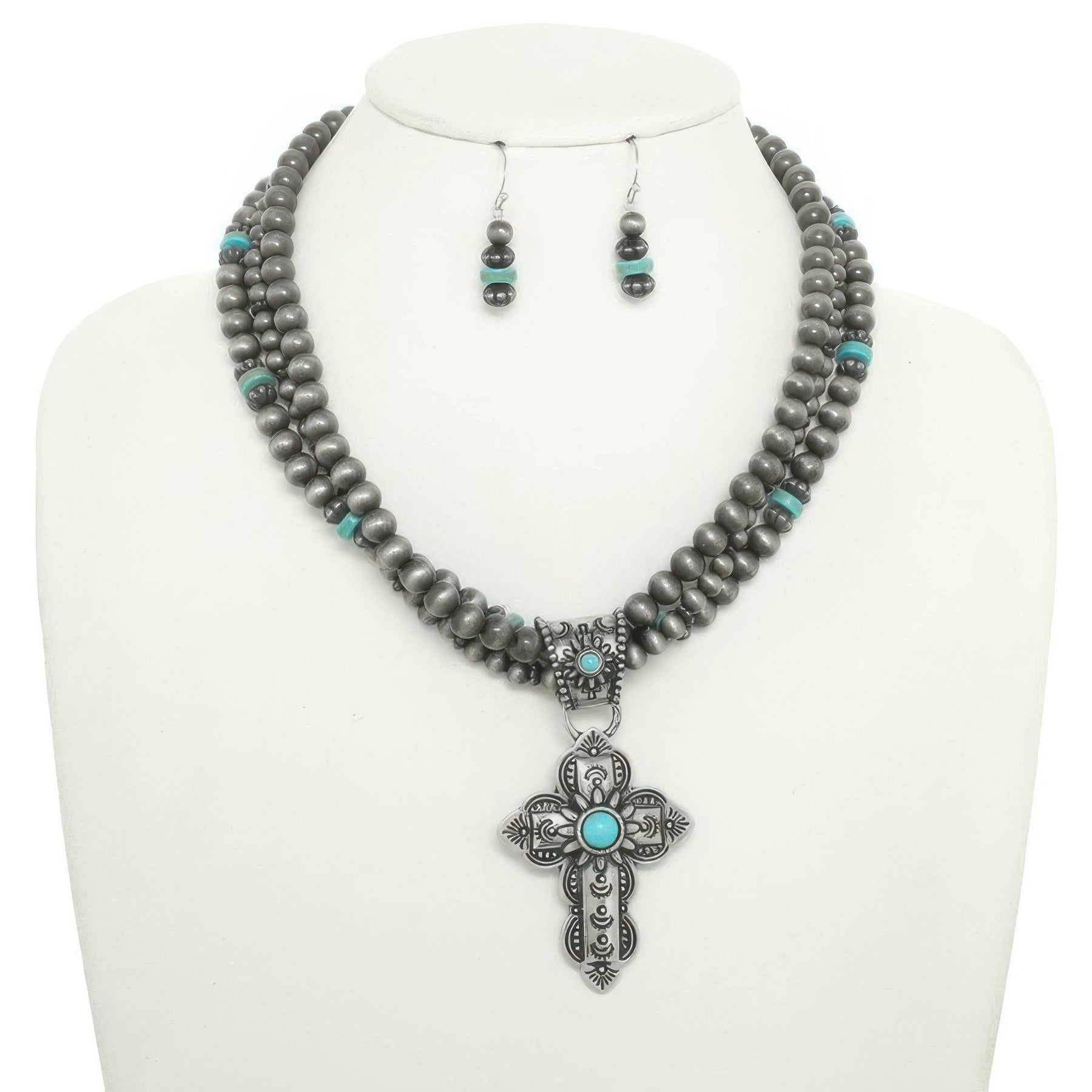 This multistrand necklace and earring set blends spiritual elegance with rustic charm. Featuring a bold turquoise cross pendant, the set is designed with layered beads and Native-inspired details. The handcrafted look and earthy tones make it a meaningful and stylish addition to any wardrobe. Coordinated earrings add balance and charm, making it ideal for faith-based occasions or as a thoughtful gift. It's a beautiful way to express both style and symbolism.