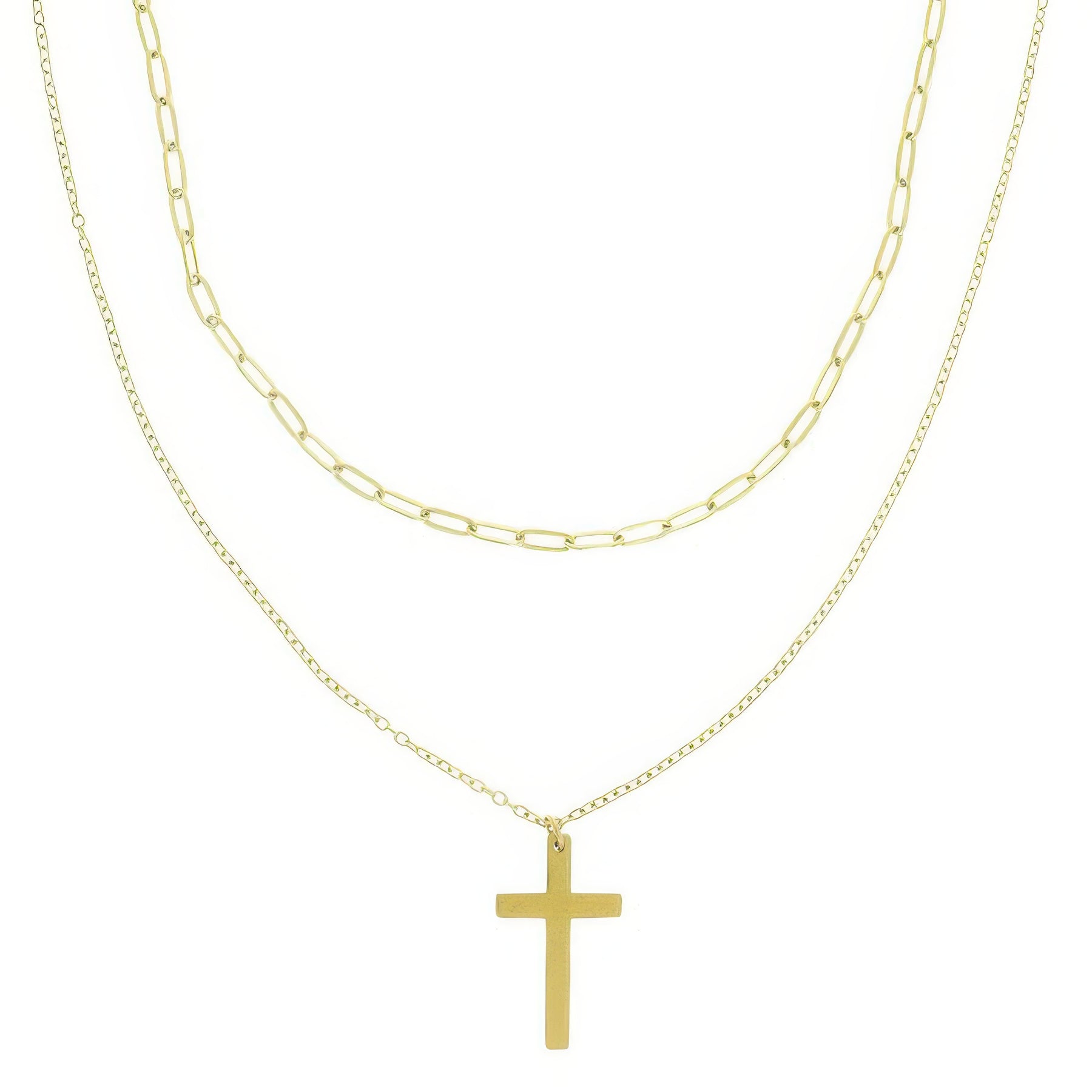 Layer your look with faith-forward style in this polished multi-strand cross pendant necklace. Designed in gold and silver tones, it combines paperclip and cable chains for a modern stacked effect. The 2.25" cross drop adds symbolic charm and shine, while the lightweight construction keeps it comfortable all day. Perfect for youth ministries, churchwear, or everyday inspiration. A bold yet wearable statement piece.