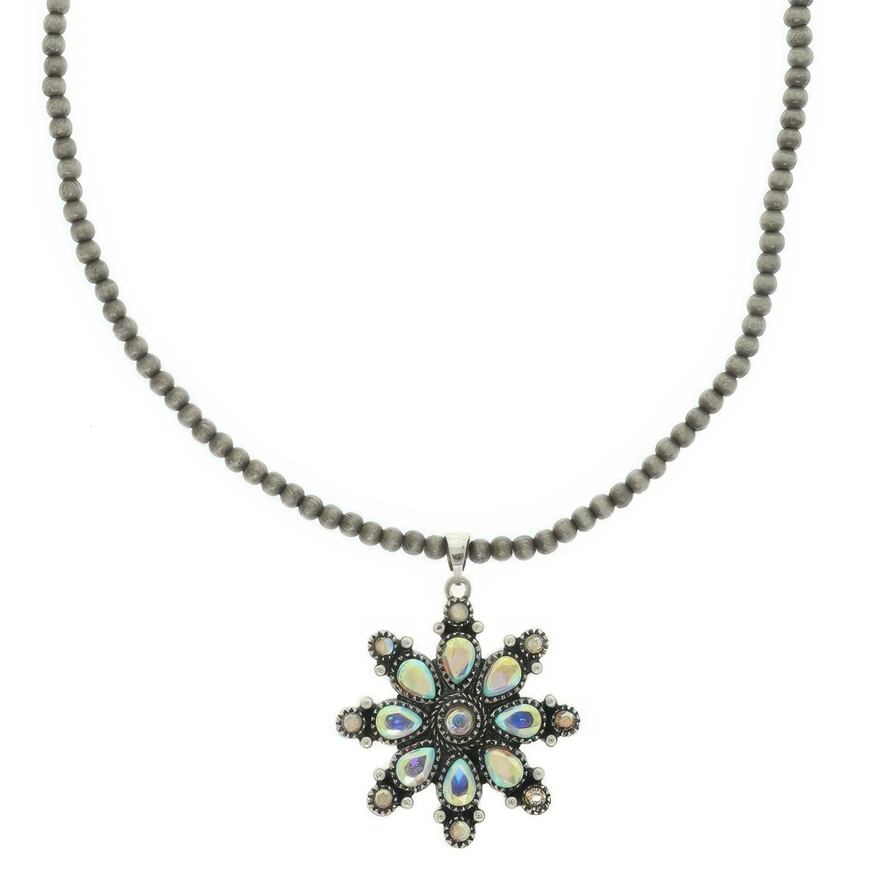This western-inspired snowflake pendant necklace adds a touch of seasonal sparkle with turquoise or crystal accents. Set on an 18-inch chain with extender, it’s lightweight and comfortable for all-day wear. The bold medallion design pairs beautifully with both casual and dressy outfits, making it a versatile holiday accessory. A perfect piece for cowgirl style lovers.