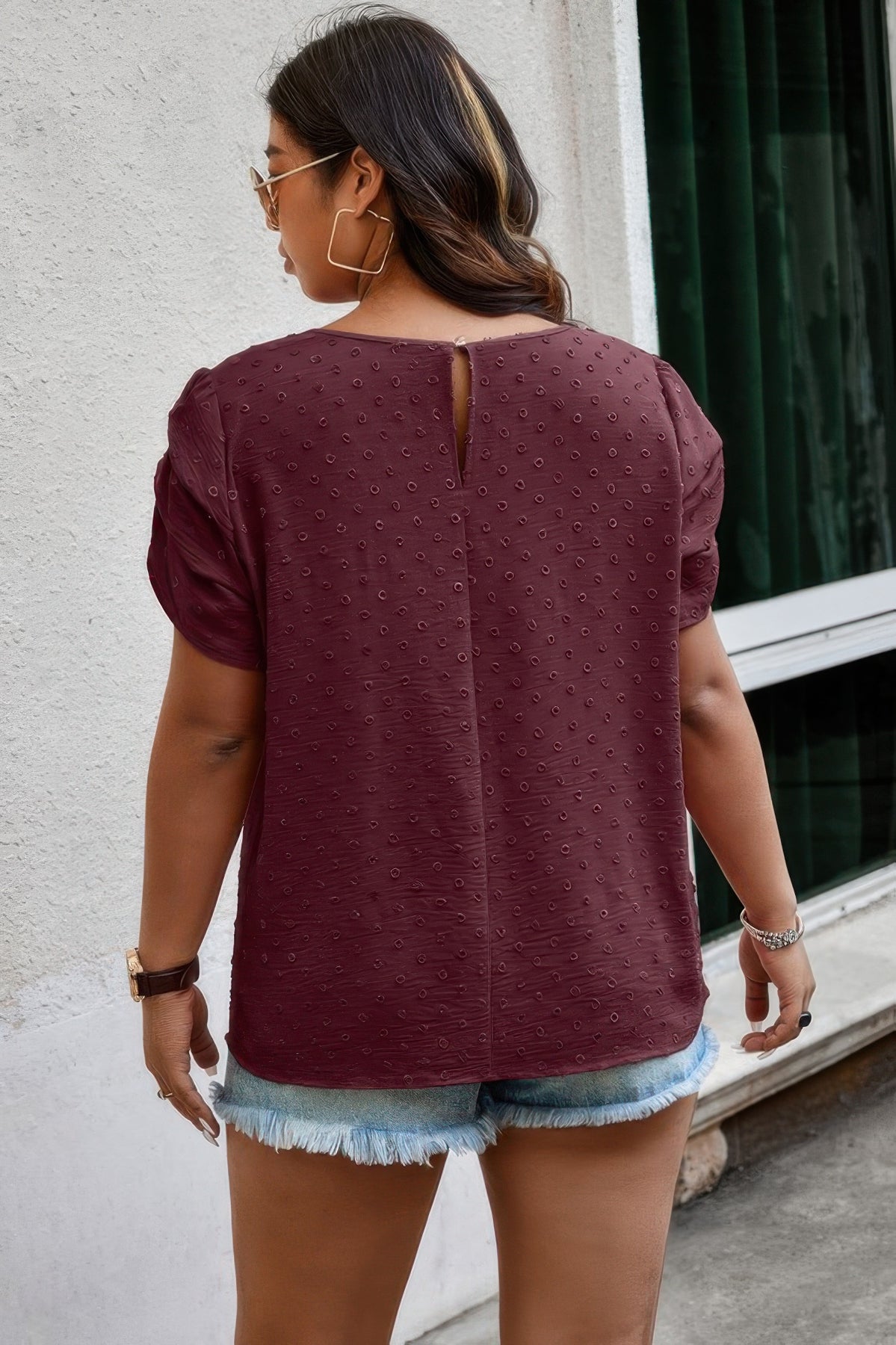 Soft texture and timeless simplicity define this plus-size Swiss dot blouse, designed for all-day comfort and effortless elegance. The lightweight fabric features a delicate dotted texture, giving subtle depth to its solid color. Short sleeves and a relaxed silhouette make it ideal for warm-weather wear, while the classic cut ensures easy pairing with your favorite bottoms. Whether you're headed to work, school, or a weekend outing, this blouse delivers versatile style that fits beautifully into any wardrobe.