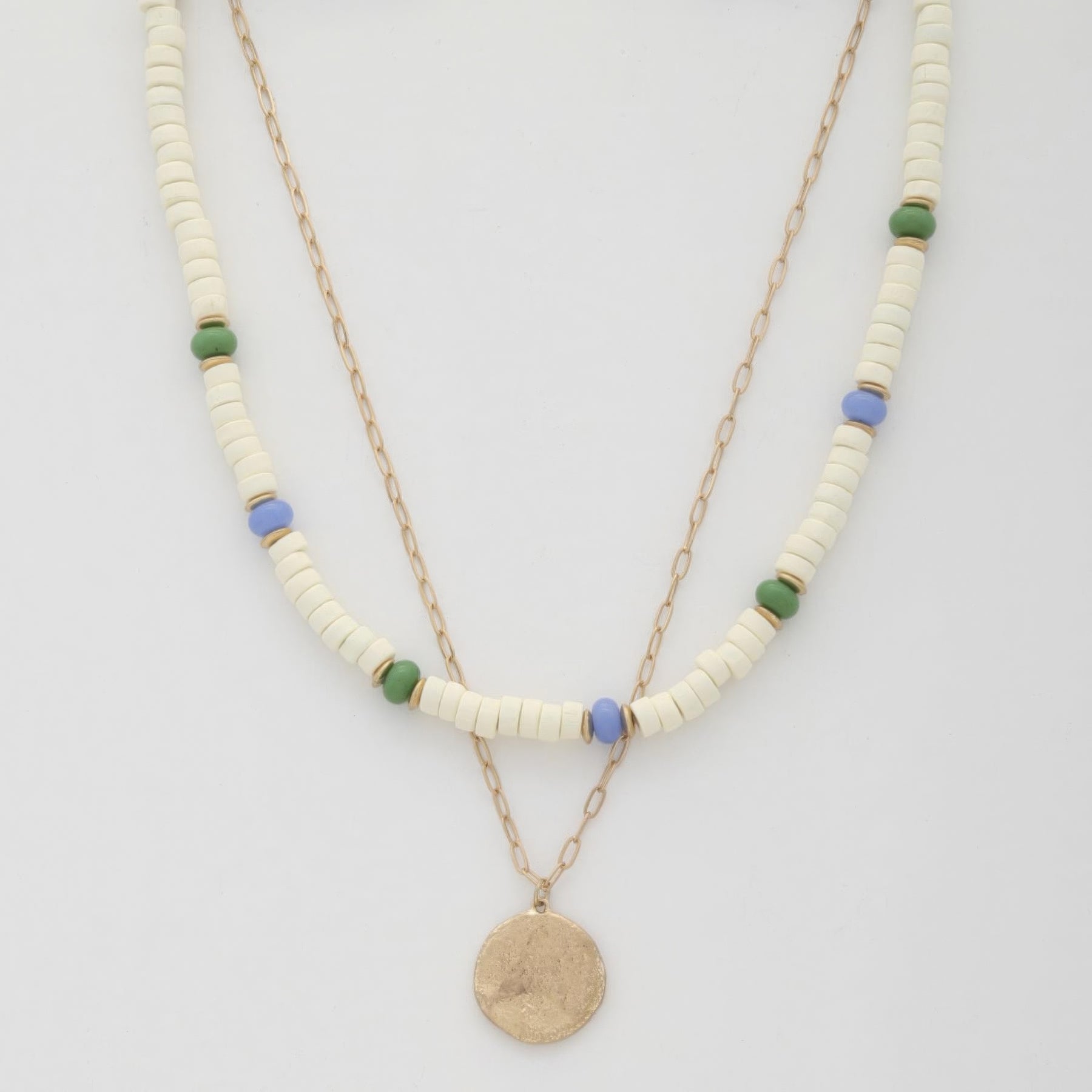 Add a touch of bohemian charm to your collection with the Coin Wood Bead Layered Necklace in Fuchsia, Ivory, or Turquoise. Add it to your cart now for a dynamic and stylish accessory!
