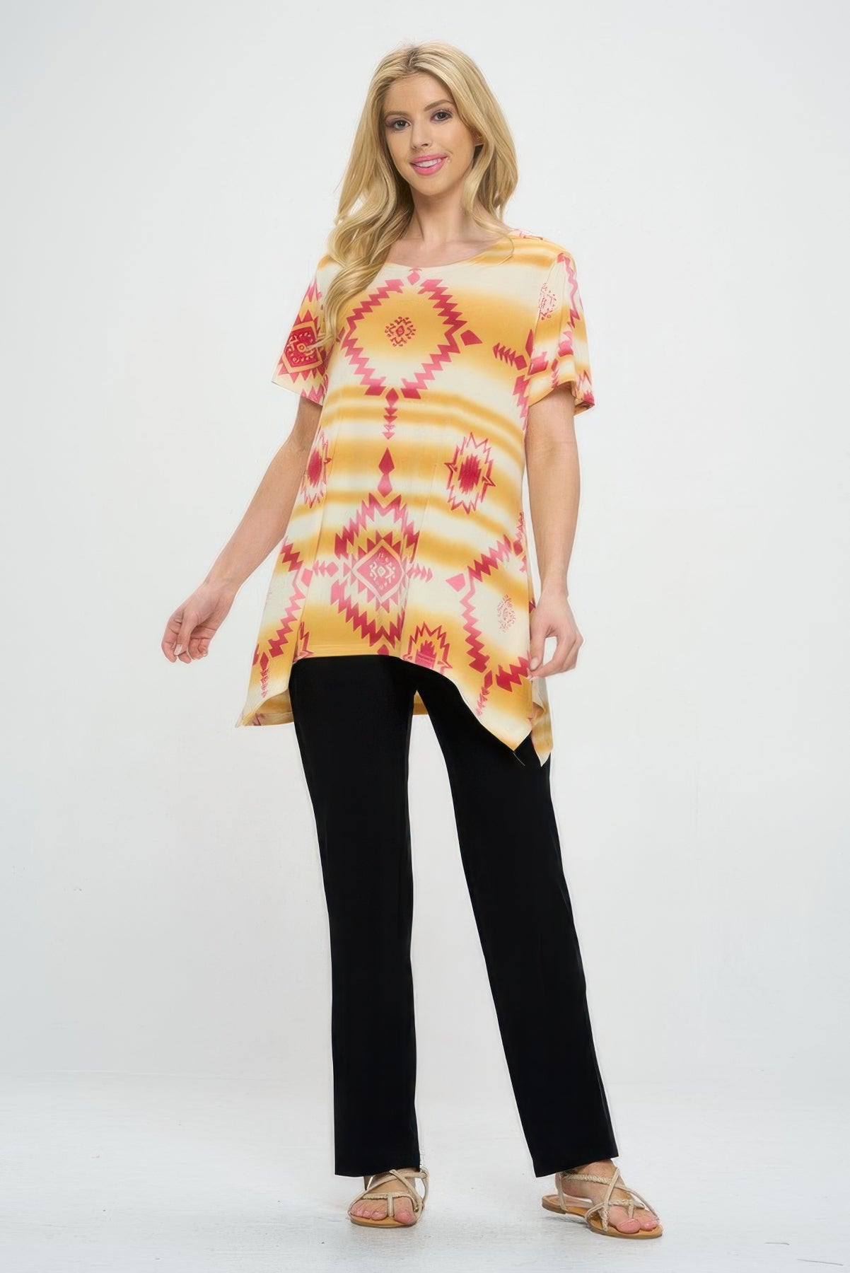 This short sleeve top combines casual comfort with stylish detail, thanks to its round neckline and handkerchief hem. The asymmetrical cut gives it a flattering, modern silhouette that pairs effortlessly with jeans, leggings, or skirts. Crafted from a soft stretch fabric, it’s made for all-day wear.